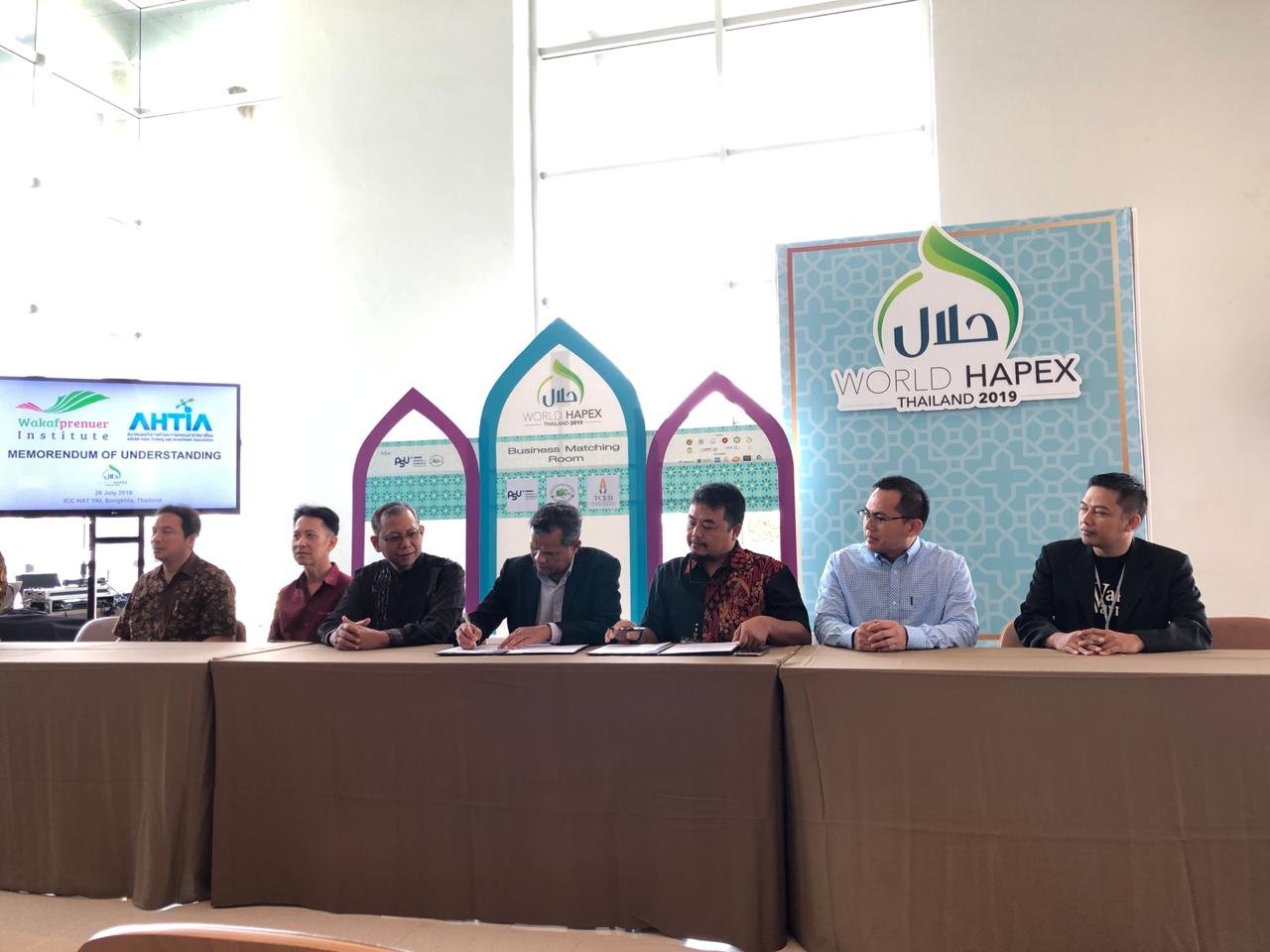 THAILAND – KNKS menyaksikan penandatangan Memorendum of Understanding antara Wakafpreneur Institute dan AHTIA Thailand (Asean Halal Trade & Investment Association) dalam acara World Halal Products Exhibition & Conference (World HAPEX) 2019 di Hat Yai, Thailand (27/5/2019).