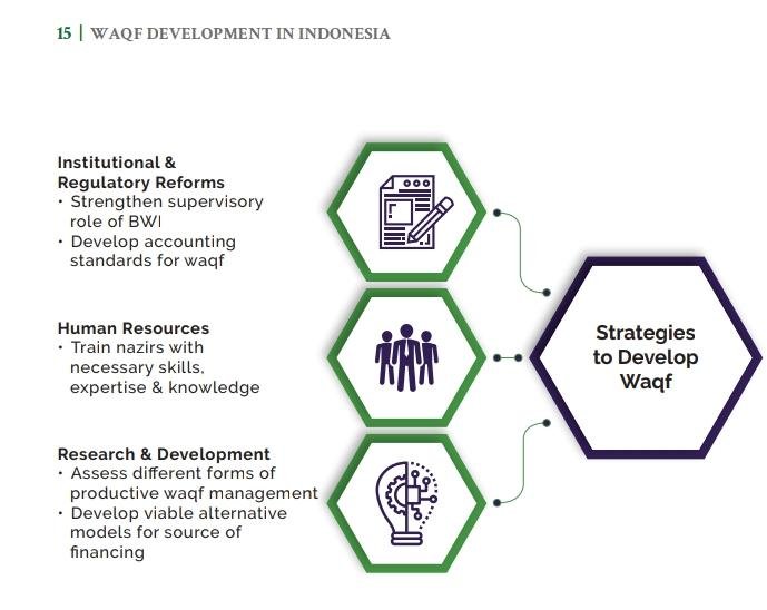 The strategy for developing waqf can be done through institutional and regulatory support, human resources, as well as research and development (R & D).