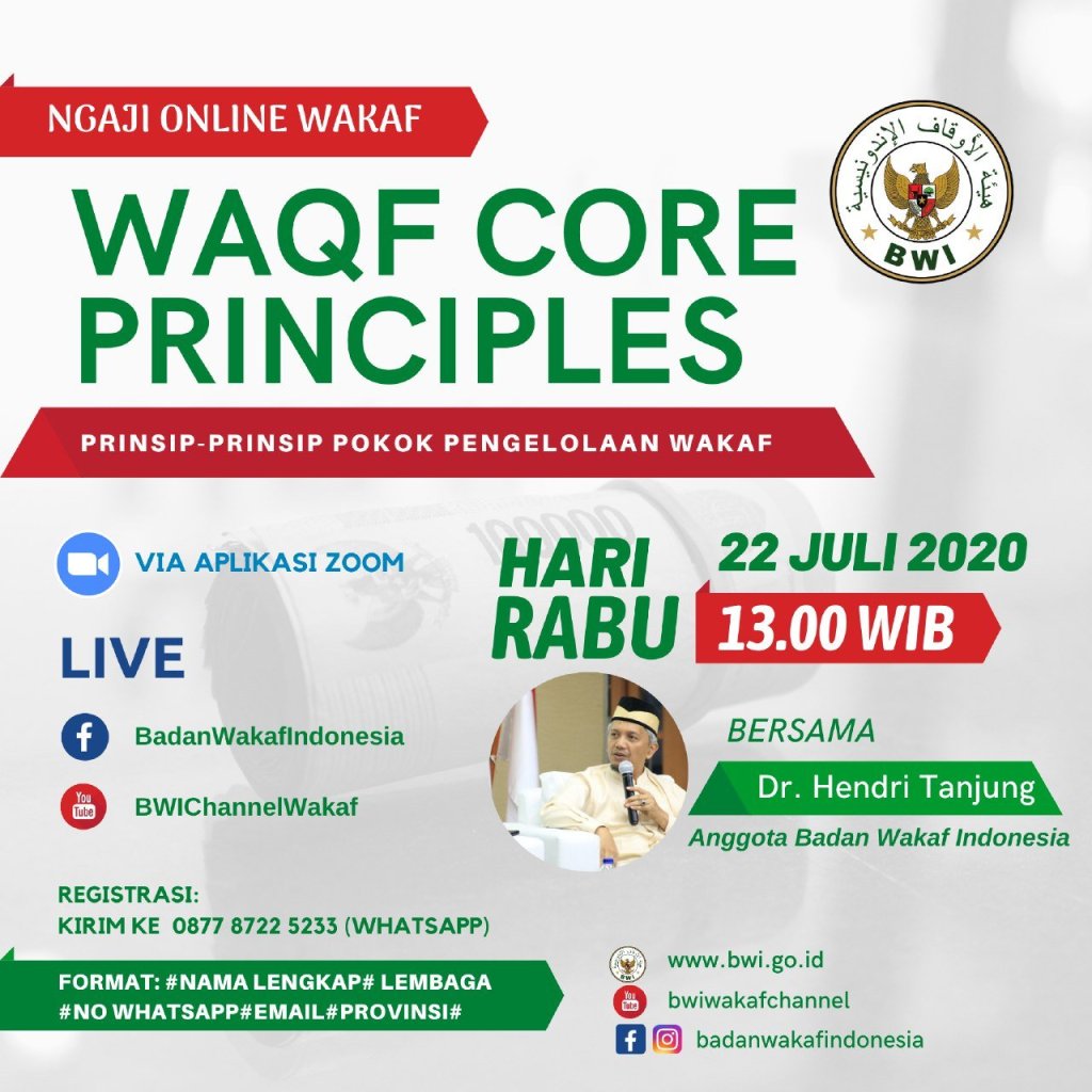 Dalam rangka meningkatkan Capacity Building Nazhir seluruh Indonesia, kami undang resmi seluruh nazhir dan Stakeholders Wakaf untuk mengetahui WAQC CORE PRINCIPLES SERIES SATU bersama DR. HENDRI TANJUNG … yang kami Jariah-kan melalui kegiatan NGAJI ONLINE WAKAF secara LIVE oleh Badan Wakaf Indonesia via aplikasi ZOOM MEETING pada :