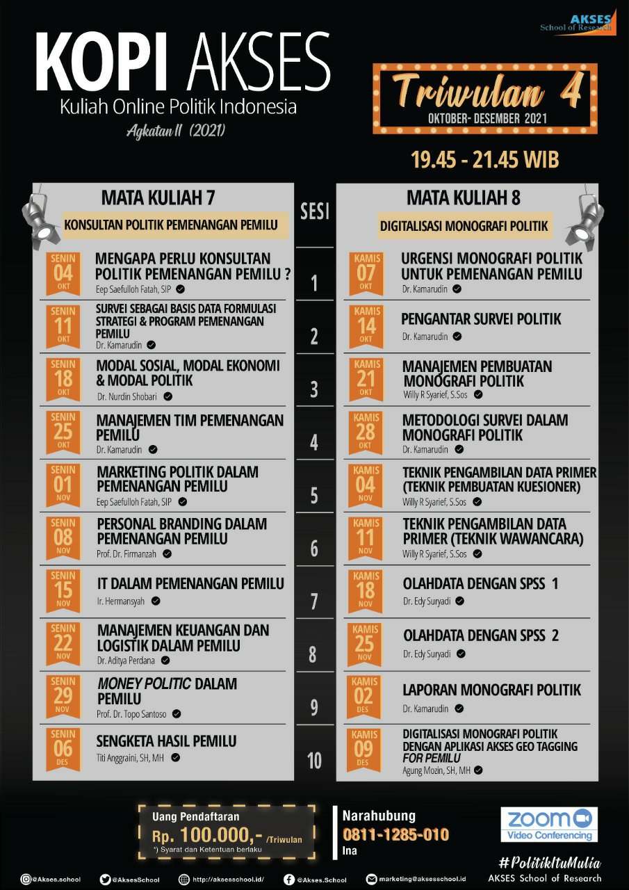 AKSES School of Research kembali melaksanakan program Kuliah Online Politik Indonesia (KOPI) AKSES, namun dengan biaya pendaftaran yang sangat terjangkau, yakni hanya Rp 100.000-, (Seratus ribu rupiah) per 1 (satu) Triwulan, dengan Syarat dan Ketentuan berlaku. Peserta harus mengikuti sebanyak 4 Triwulan perkuliahan. KOPI AKSES adalah kuliah informal politik Indonesia pertama secara daring yang diisi oleh narasumber berkompeten dari pelbagai kampus ternama, serta praktisi. Kelebihan lain dari KOPI AKSES adalah bobot materi yang banyak bersifat aplikatif yang dikaitkan dengan persiapan Pemilu 2024.