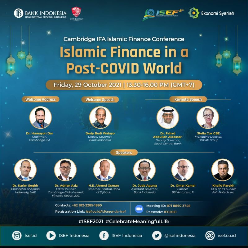 The most awaited event is finally happening. Cambridge IFA and Bank Indonesia jointly present the Islamic Finance Conference, revolving around the GIFR 2021 theme of ‘Islamic Finance in a Post-COVID World’. Leading experts and market leaders come together to discuss the implications that this current pandemic has instigated in the global economic system and the outlook of the post-COVID world.