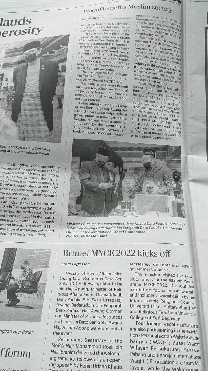 Alhamdulillaah, pada tanggal 1-4 Juni 2022 Wakafpreneur mendapat kesempatan berpartisipasi hadir di pekan pertama event ini sekaligus mengikuti Konferensi Waqaf Antarbangsa dengan tema: “Merealisasikan Perlaksanaan dan Pengurusan Waqaf Secara Komprehensif”. Konferensi ini turut dihadiri oleh Dato Paduka Seri Setia Ustaz Haji Awang Badaruddin bin Pengarah Dato Paduka Haji Awang Othman selaku Menteri Agama Negara Brunei Darussalam serta Dato Seri Setia (Dr.) Haji Awang Abu Bakar bin Haji Apong selaku Menteri Urusan Dalam Negeri Negara Brunei Darussalam.