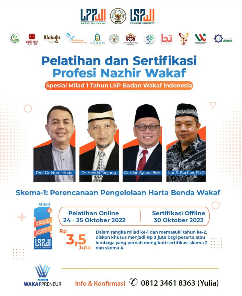 Alhamdulillah Wakafpreneur Institute bekerjasama dengan LSP BWI akan meramaikan milad 1 Tahun LSP BWI sekaligus menggelar Sertifikasi Profesi Nazhir wakaf kolosal pada akhir Oktober 2022. Let’s join